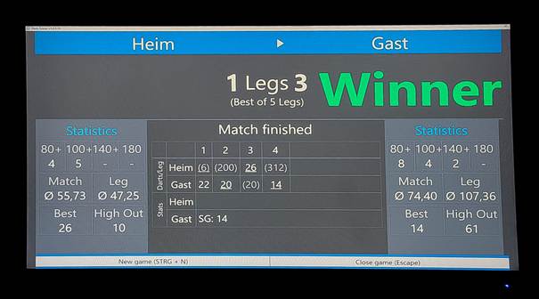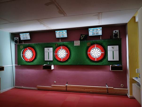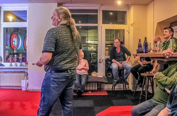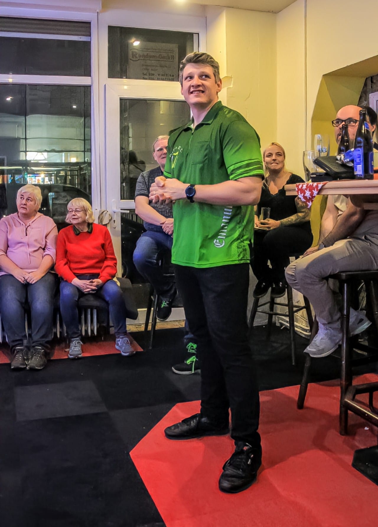 Bevor die ersten Pfeile fliegen, soll noch erwähnt werden, dass dies die offizielle Einweihung unserer neuen digitalen Dartanlage ist. Am Abend (bzw. bis in die Nacht) vorher hatte Matthias noch im Raum gestanden und an den Rechnern gearbeitet, damit das Fest und die Meisterschaft stattfinden konnten. Großen Dank vom ganzen Verein dafür an Matthias.